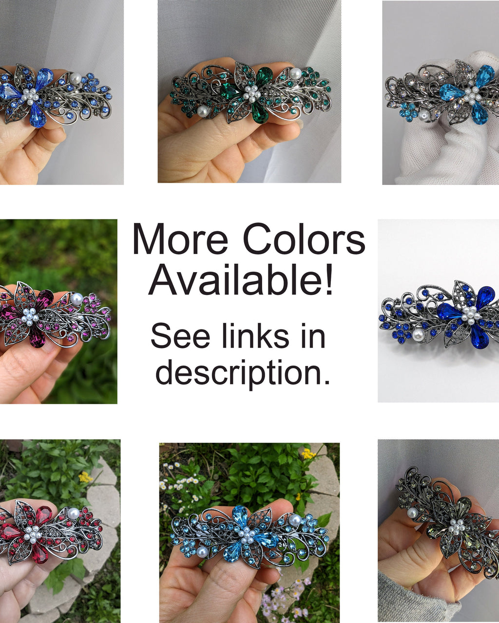 This design is also available in other colors! I can customize your barrette with crystals in these colors: Emerald, Siam (deep red), Amethyst, Majestic Blue (Cobalt color), Aquamarine, Teal and Black Diamond.  This design is also available in other colors!  Click  =>here<= to see those.