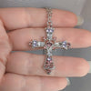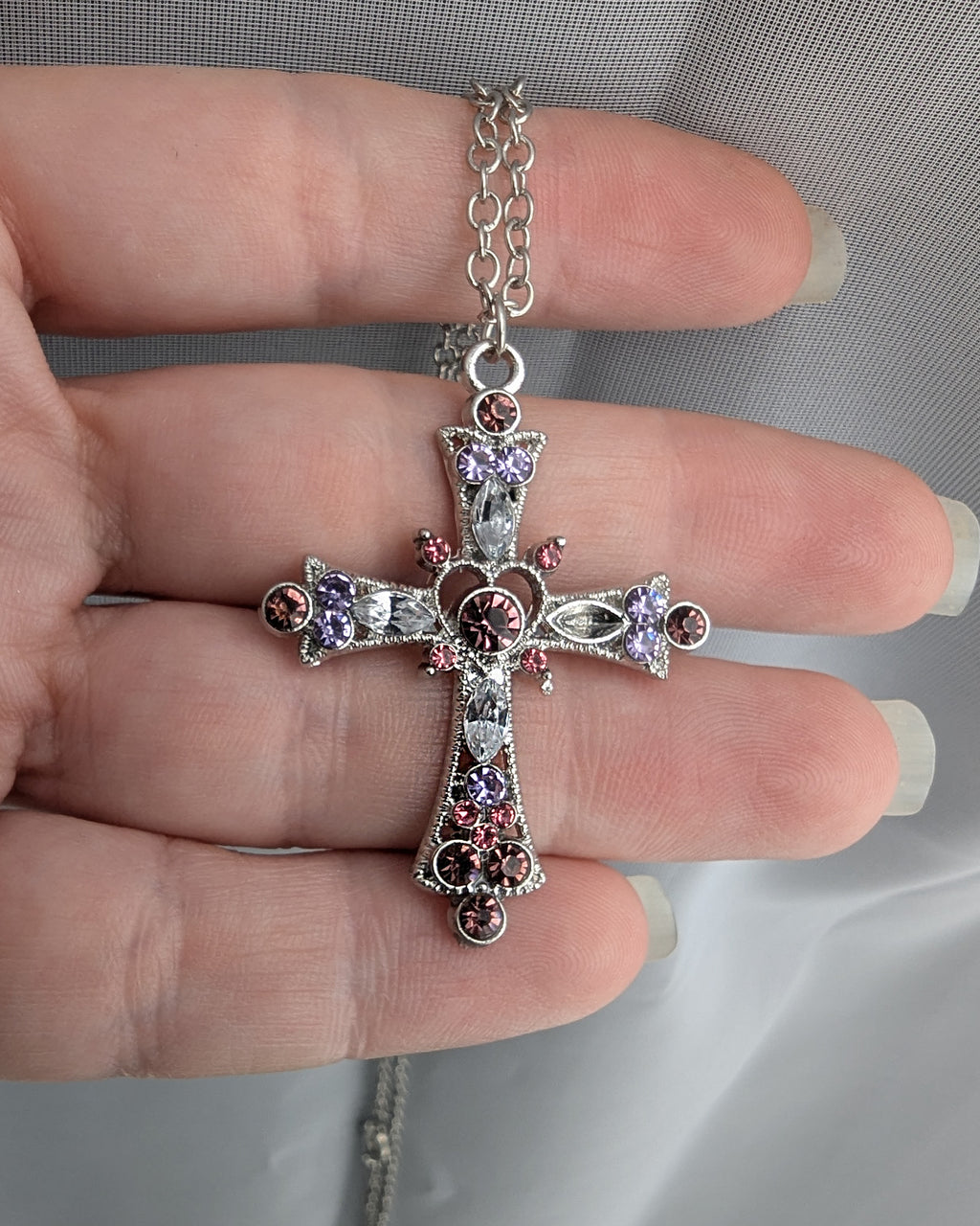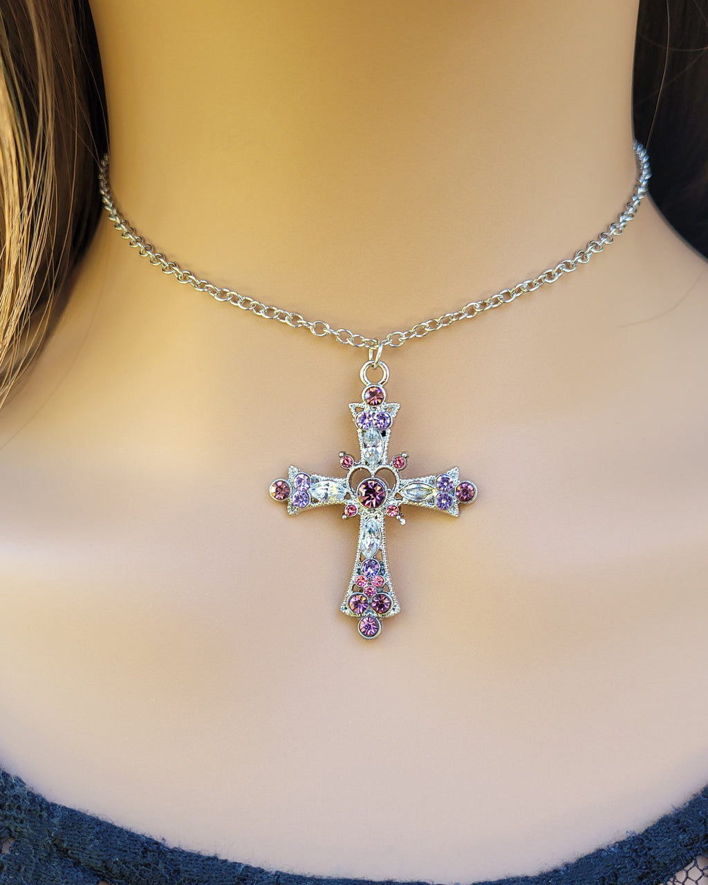 This sparkling crystal cross pendant necklace blends elegance with meaningful style. The silver-tone cross is accented with shimmering pink and purple crystals, featuring a heart-shaped detail at the center for a touch of romance and symbolism.