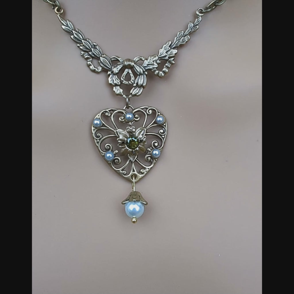 Vintage Brass Heart Necklace with Pearls & Peridot CZ Green Crystal, Romantic Jewelry