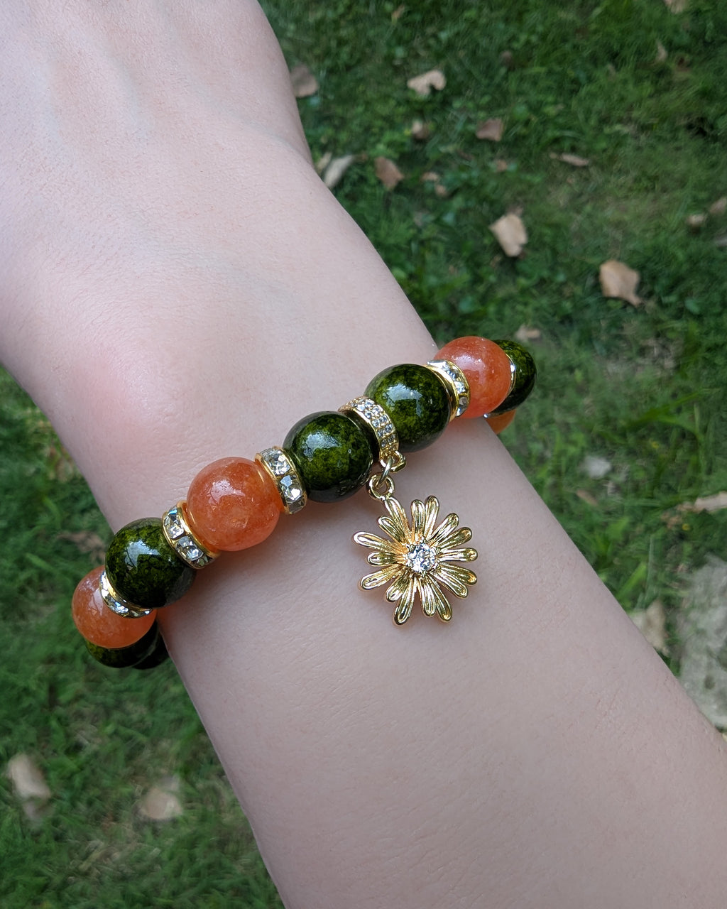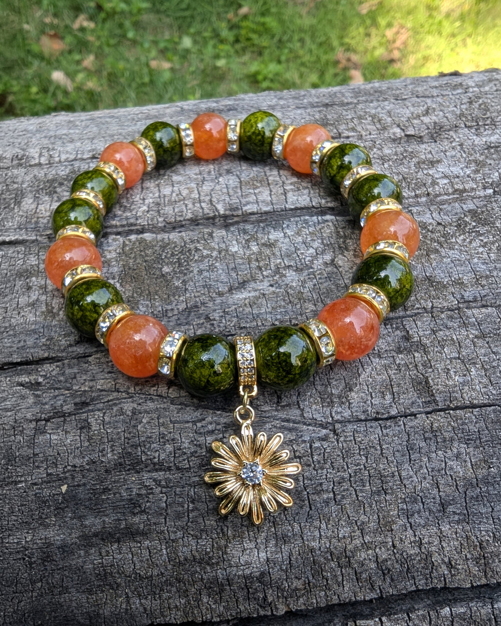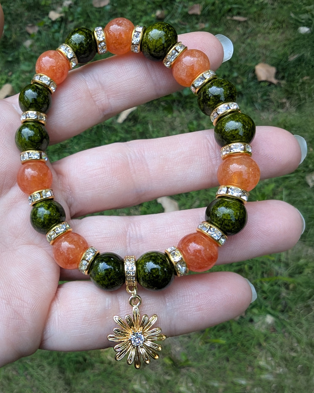Stride into the season with this stunning handmade gemstone stretch bracelet, featuring a vibrant mix of 10mm natural orange sunstone beads and deep 10mm green jade beads. Sparkling CZ crystal rondelle spacers add a touch of elegance, while the centerpiece—a radiant 18k gold plated sun charm with a CZ stone—symbolizes warmth, light, and positivity.