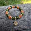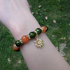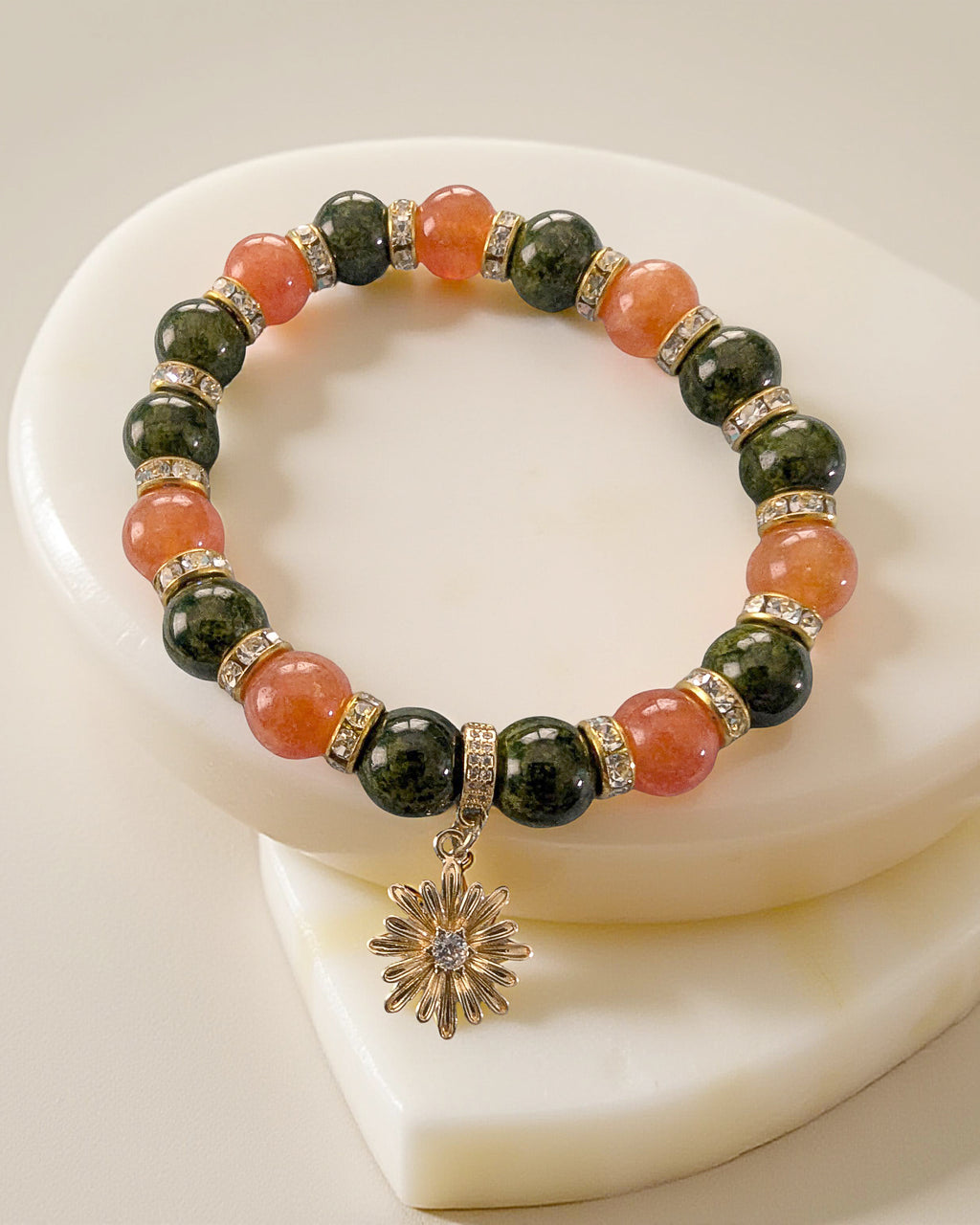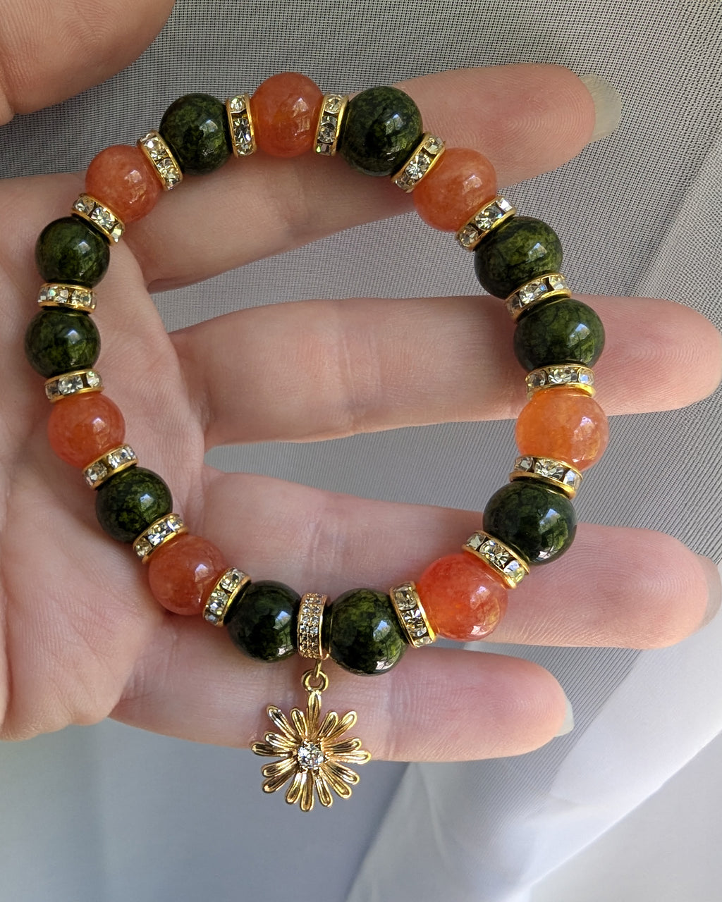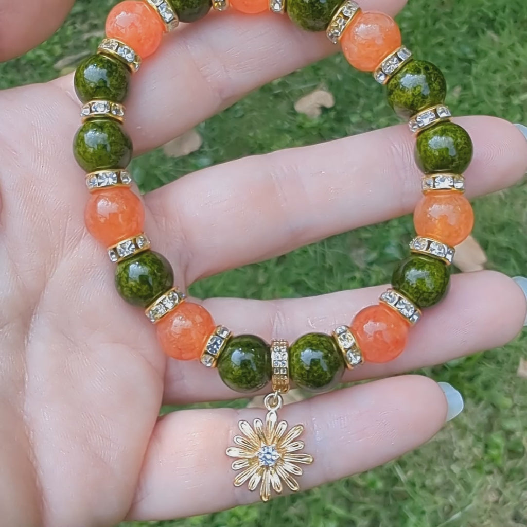 Stride into the season with this stunning handmade gemstone stretch bracelet, featuring a vibrant mix of 10mm natural orange sunstone beads and deep 10mm green jade beads. Sparkling CZ crystal rondelle spacers add a touch of elegance, while the centerpiece—a radiant 18k gold plated sun charm with a CZ stone—symbolizes warmth, light, and positivity.