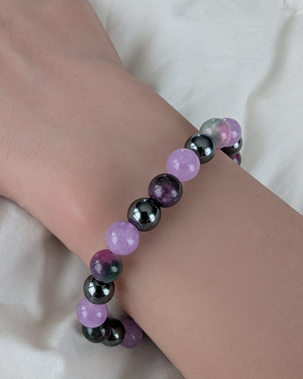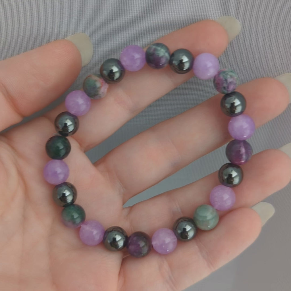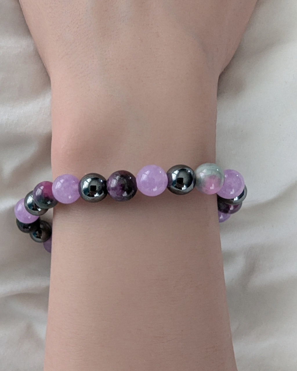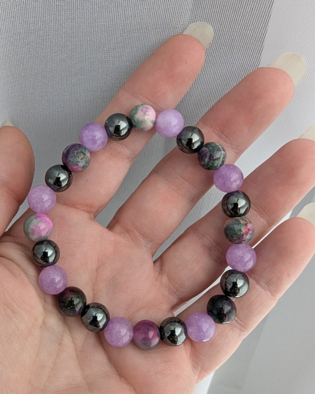 Find peace and balance with this beautiful natural stone beaded bracelet, thoughtfully crafted to promote emotional calm and clarity. This stretch bracelet features a soothing combination of 8mm violet chalcedony, hematite, and Persian jade stones—each chosen for its supportive, healing energy.