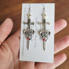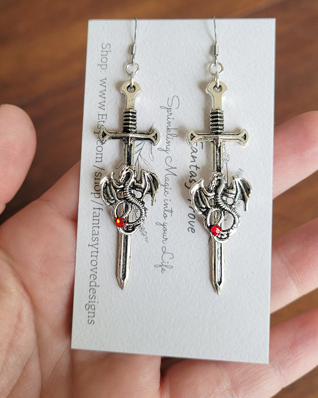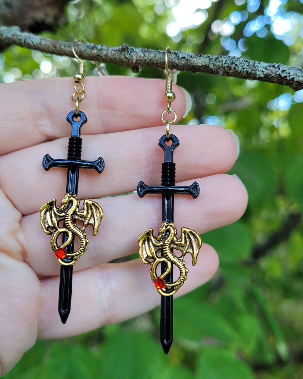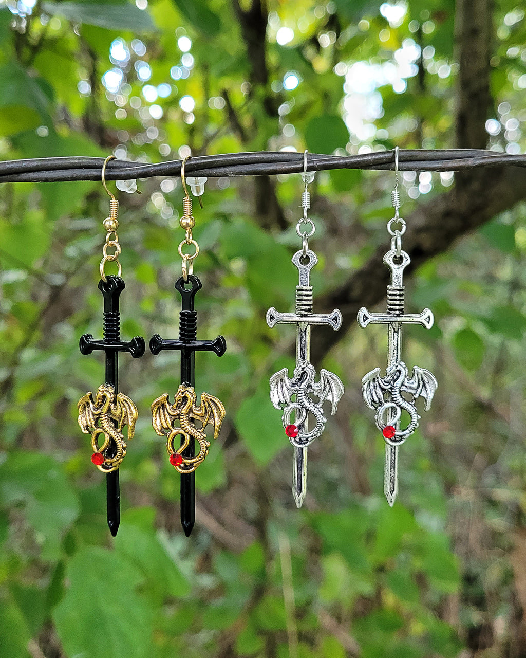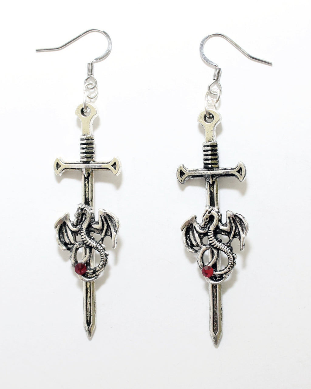 Unleash your inner warrior with these striking dragon sword earrings. Each pair features a fierce dragon wrapped around a detailed sword, finished with a touch of red crystal for an extra hint of fire and magic.