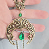 The rich emerald green paired with warm brass creates a bold yet elegant statement — perfect for lovers of celestial jewelry, gothic fashion, and unique artisan pieces.