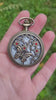 The pocket watch measures approximately 2" x 2" and will come on a bronze chain in the length of your choice. If you're not sure what chain length you need then let me know and I can make it adjustable within 2".