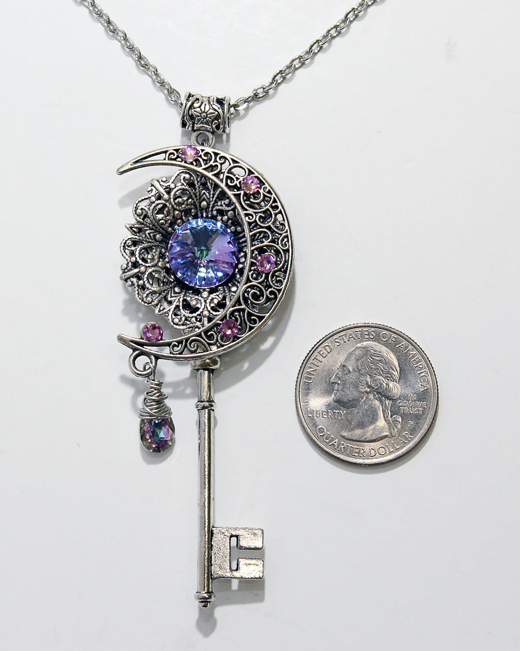 Magical Silver fantasy Moon key necklace with Pink and Purple Vitrail Swarovski crystals, Unique Fantasy Jewelry Gift, Fairy Jewelry.  Magical jewelry