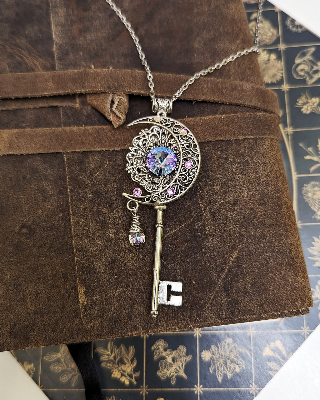 Magical Silver fantasy Moon key necklace with Pink and Purple Vitrail Swarovski crystals, Unique Fantasy Jewelry Gift, Fairy Jewelry