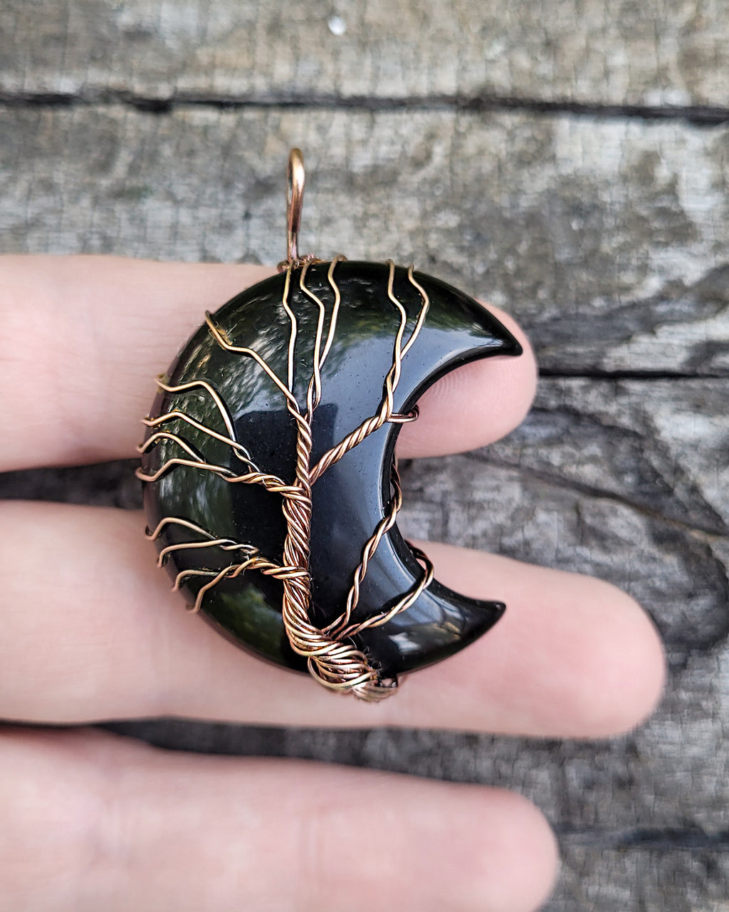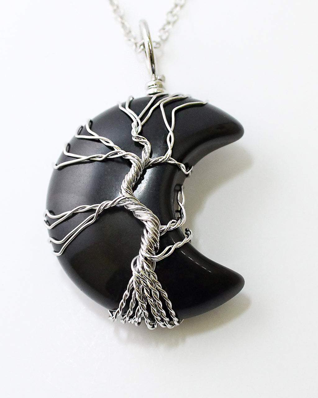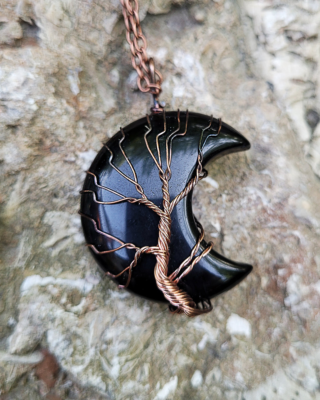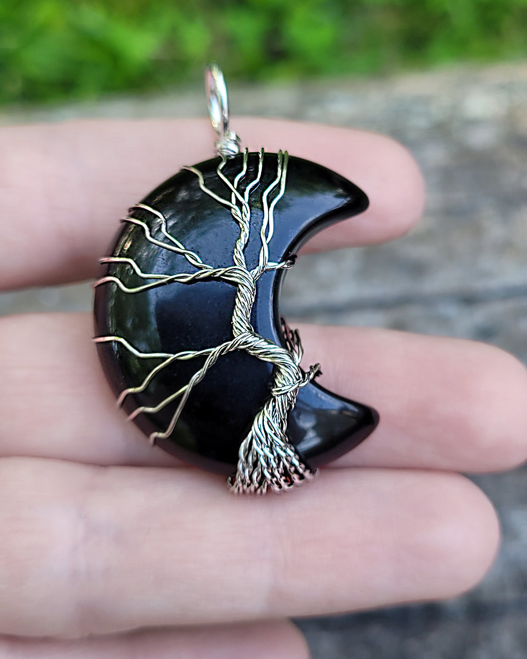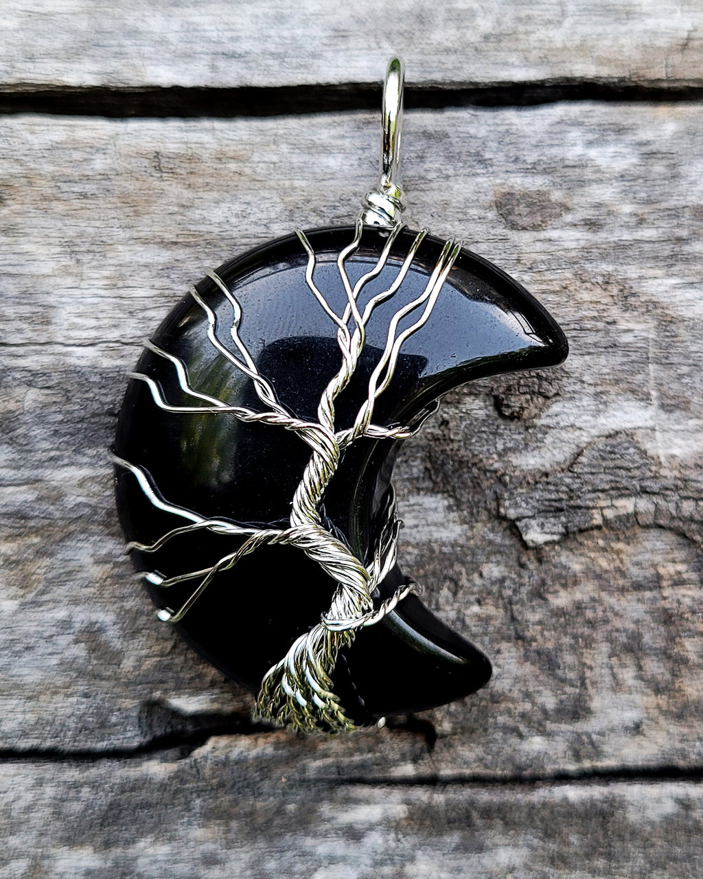 • Black Obsidian Stone Wire Wrapped Crescent Moon Necklace, Tree of Life Jewelry, Healing Stones, Gothic Jewelry