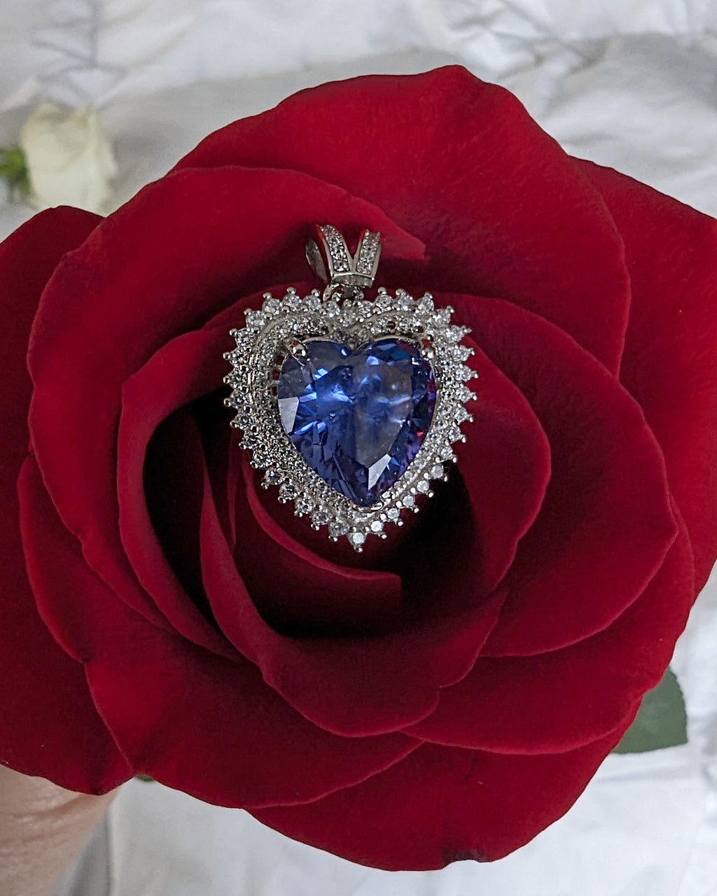 The heart pendant measures 1" tall and 3/4" wide. The Tanzanite heart stone is 12mm x 12mm. The matching heart earrings are 1" long and 1/2" wide. The earring heart stones are each 8mm x 8mm.
