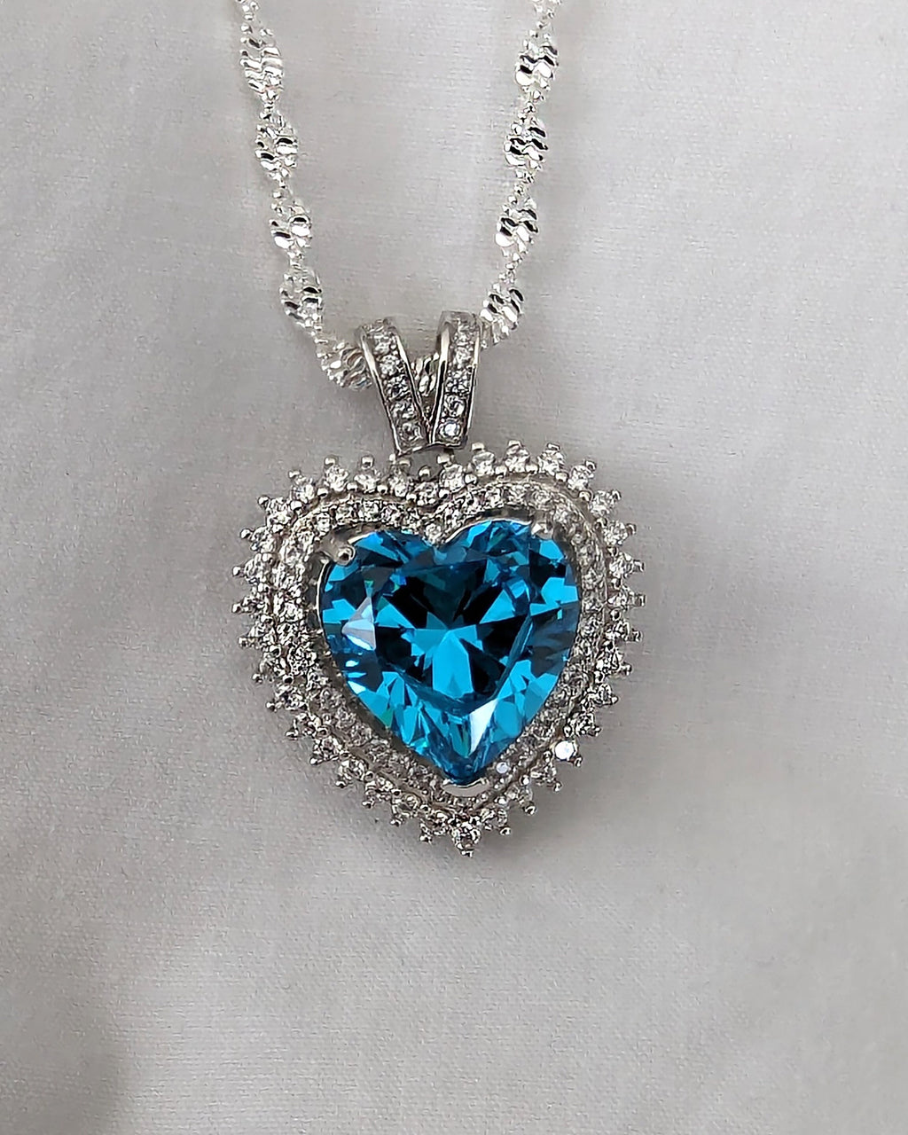 This gorgeous Sterling Silver cubic zirconia studded Blue Topaz (Aqua color) heart necklace and earring set would make the perfect classy gift for a bridesmaid, as an anniversary gift, for Valentine's Day or for Mother's Day. Blue Topaz is one of the birthstones for those born in December, making it a thoughtful birthday gift as well!