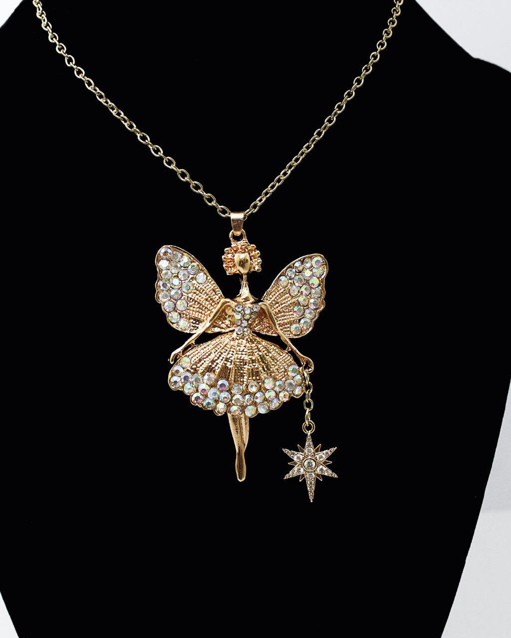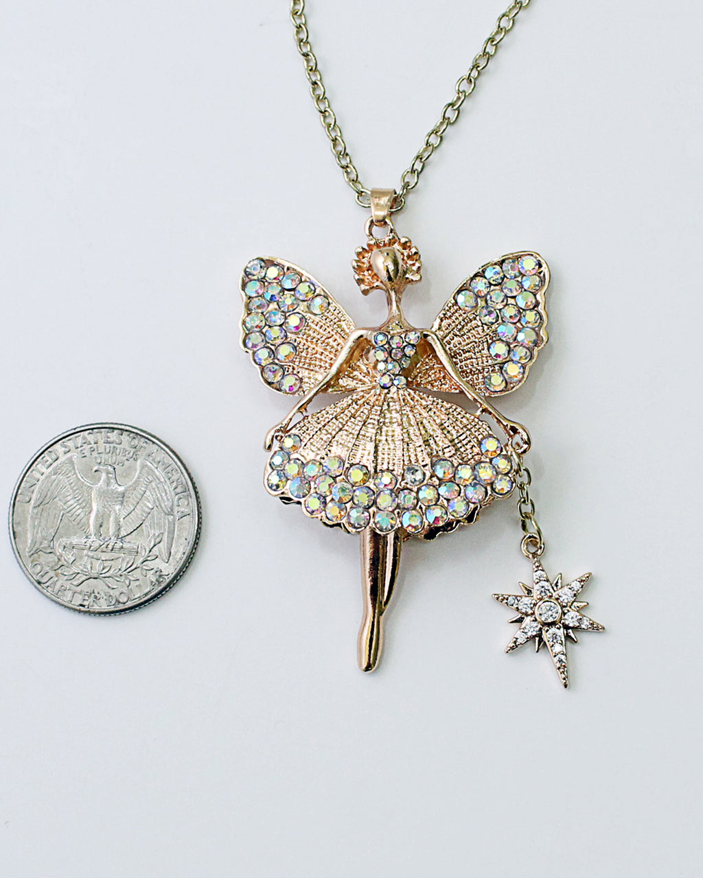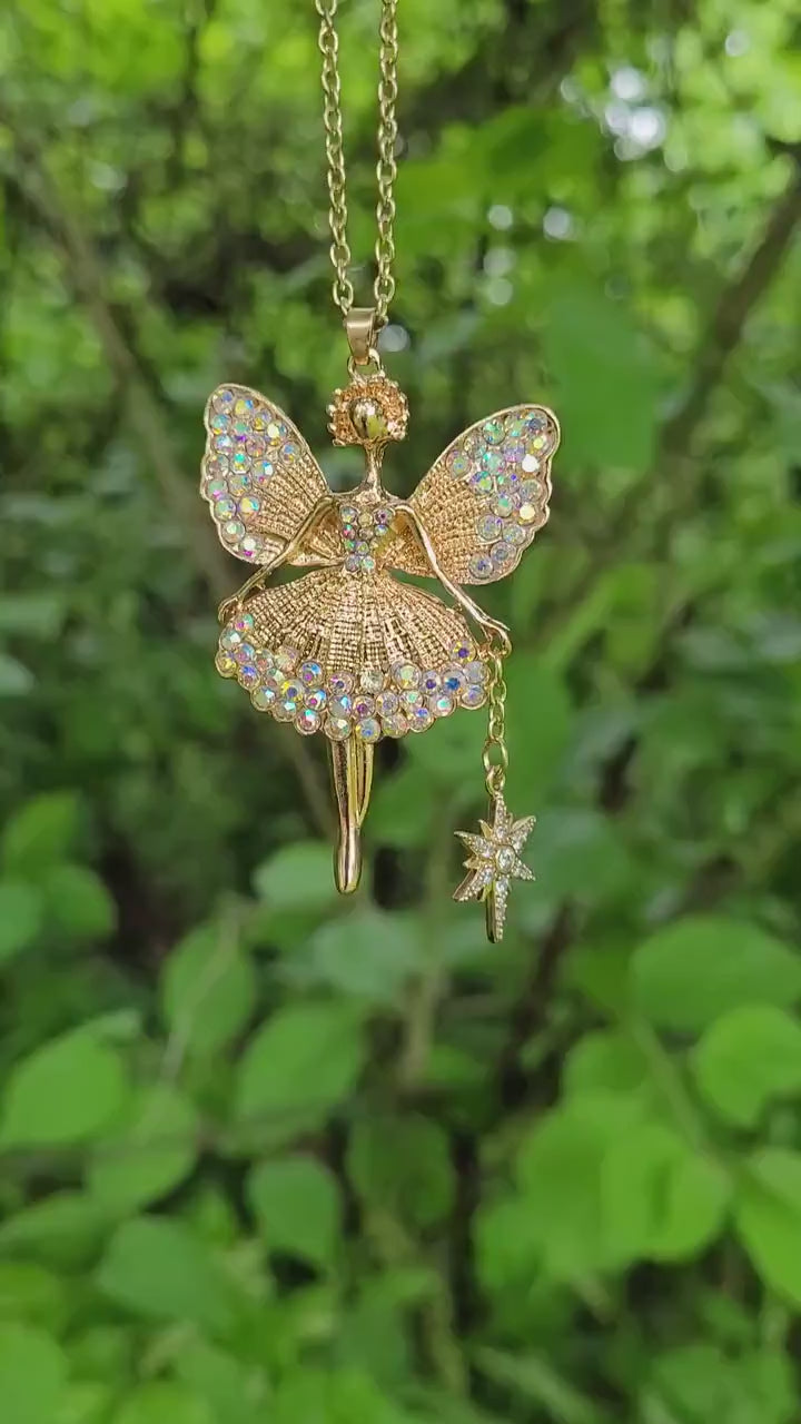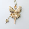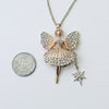 This magical fairy ballerina is gold toned and comes equipped with her very own starry wand and many sparkly rhinestones. Her legs swivel from side to side and she's wearing a puffy skirt. She measures 2-1/2" tall and 1-1/2" wide and will come on a gold color chain in the length of your choice.