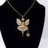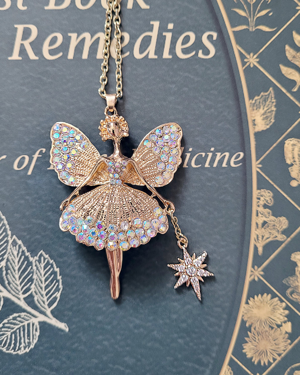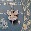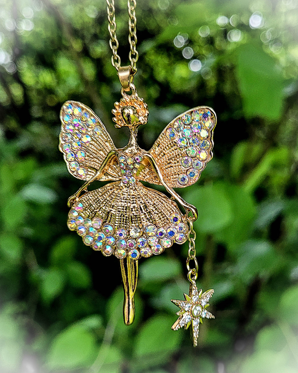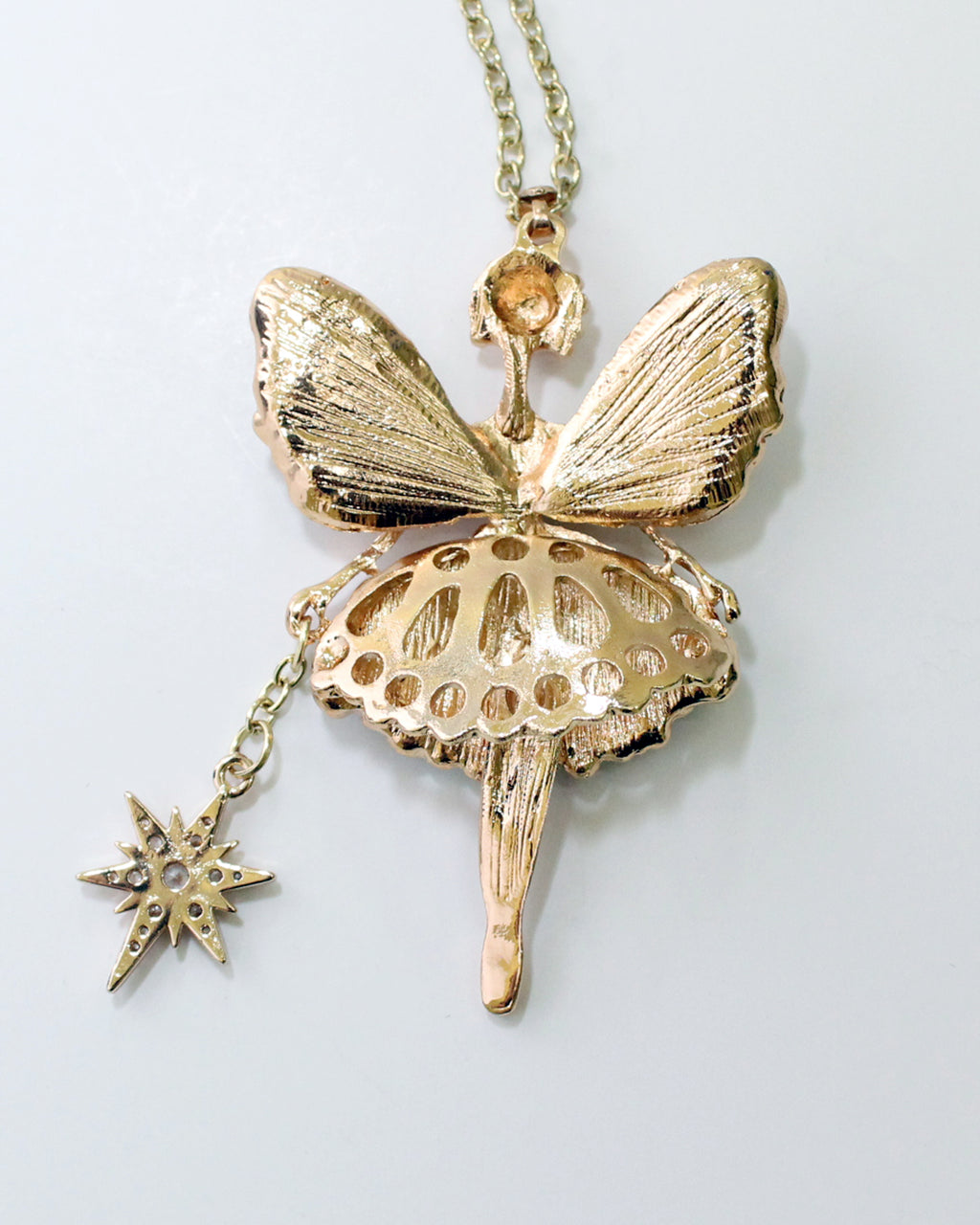 This magical fairy ballerina is gold toned and comes equipped with her very own starry wand and many sparkly rhinestones. Her legs swivel from side to side and she's wearing a puffy skirt. She measures 2-1/2" tall and 1-1/2" wide and will come on a gold color chain in the length of your choice.