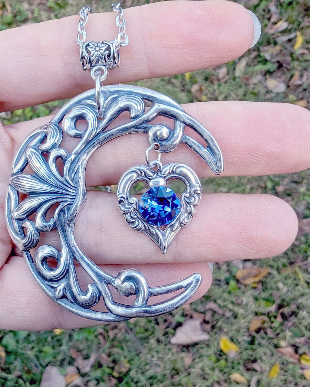 This large crescent moon pendant was produced using vintage tools and dies. It measures approximately 2" x 2" and has a brass, nickel free, base. The piece supports a romantic theme with a lovely silver heart and Sapphire Swarovski crystal.