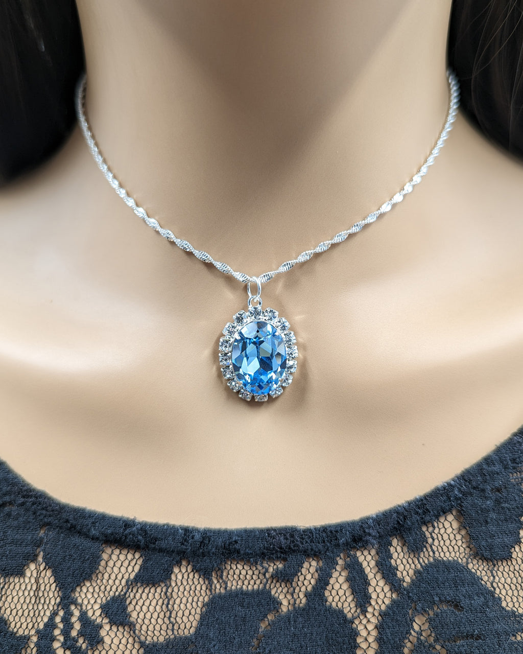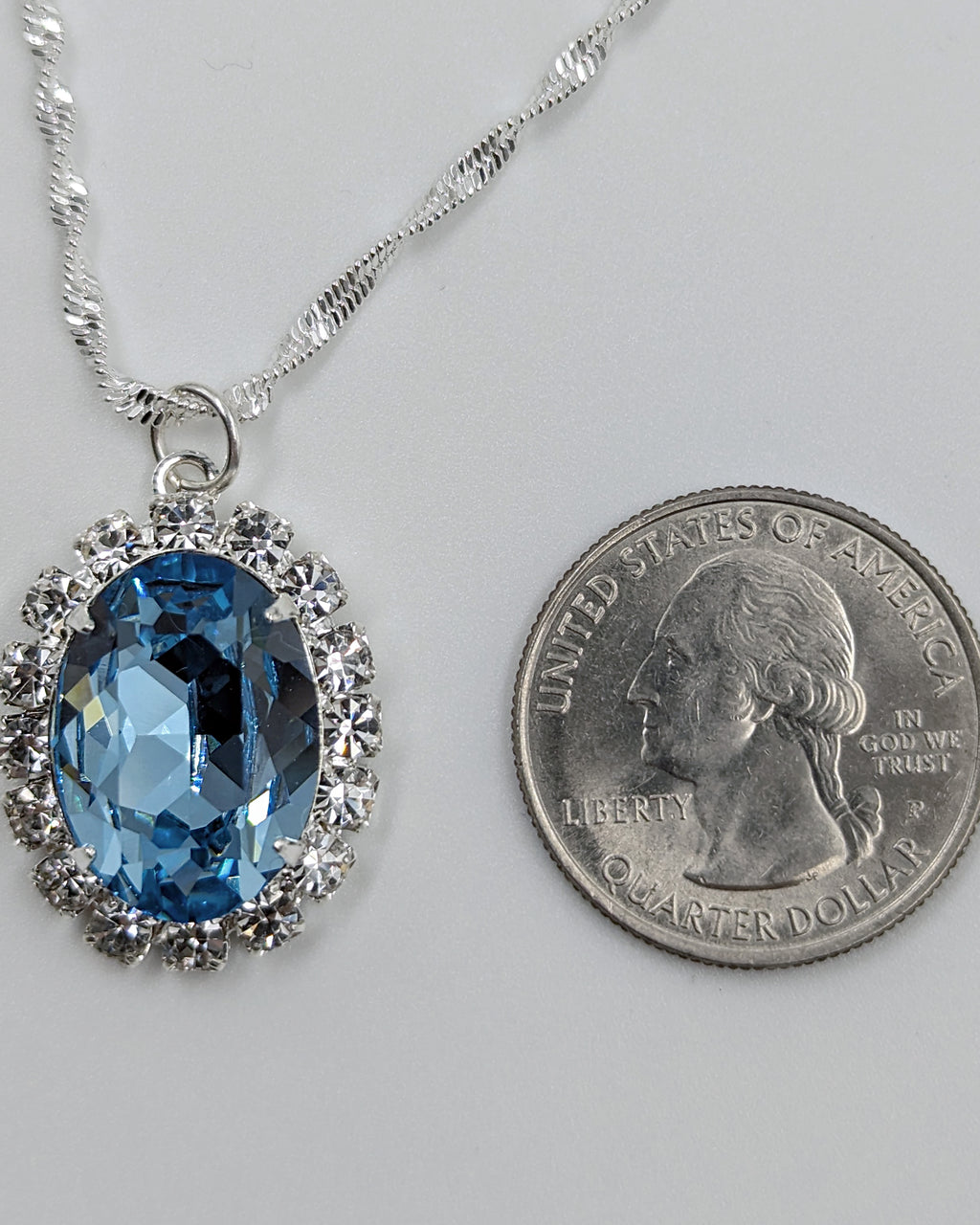 This gorgeous bridal crystal necklace and earring set features Aquamarine colored Swarovski crystals and matching Swarovski beads.  The edge of the oval shaped pendant is accented with smaller clear Swarovski crystals to add extra sparkle.