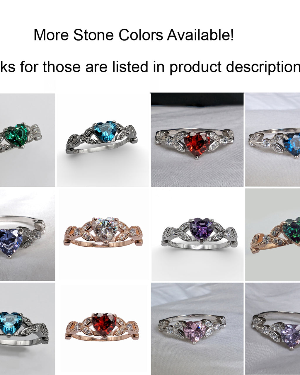 Brilliant sparkle with lush Garnet colored Cubic Zirconia stones, these heart shaped engagement rings have a core of solid S925 Sterling Silver, making them hypoallergenic and built to last. The high quality faceted heart stone is 6mm (0.8 carat) and have a Mohs hardness of 8-1/2. Sprinkled generously with cubic zirconia rhinestones, this ring is accented by a nature-inspired tree branch and leaf design.