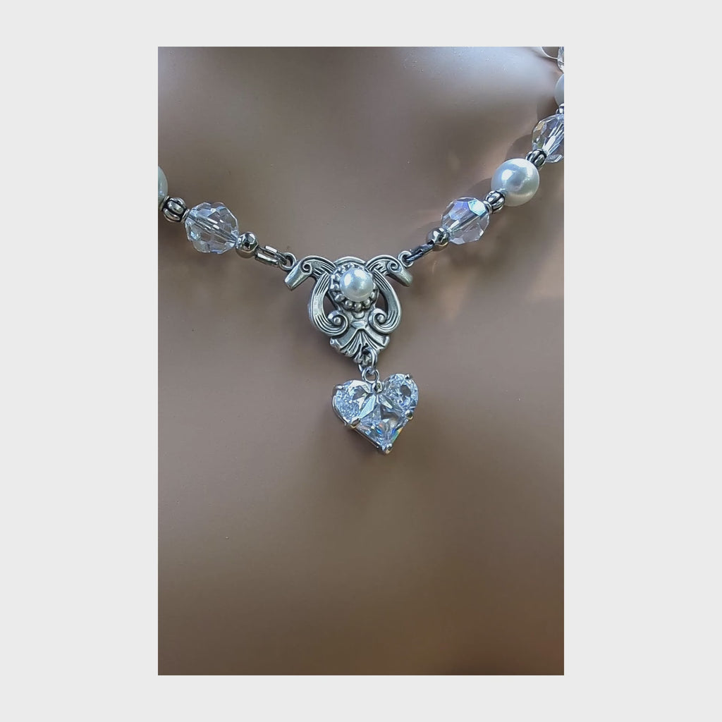 Radiate timeless romance with this handmade silver vintage-style bridal necklace, thoughtfully designed to capture the elegance of a bygone era. At its center is a sparkling heart-shaped cubic zirconia pendant—an enduring symbol of love—framed by a graceful arrangement of Swarovski crystal beads and pearls.