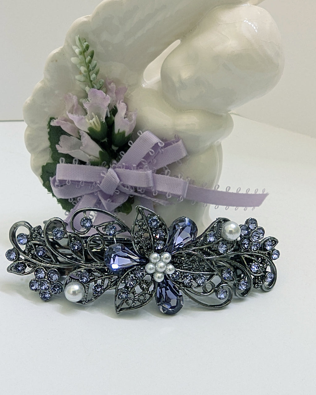The fancy hair barrette possesses an elven charm with a playful design of antique silver toned leaves and flowers and several crisp Tanzanite Swarovski crystals. With the allure of diamonds, Swarovski Crystals are made in Austria and are the highest quality lead free glass-cut crystals on the market, with extra facets and gold foiling for outstanding brilliance and sparkle.