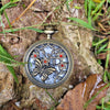 This delightful bronze pocket watch necklace features a charming butterfly fluttering about some jewel covered flowers, made with top quality Swarovski rhinestones.