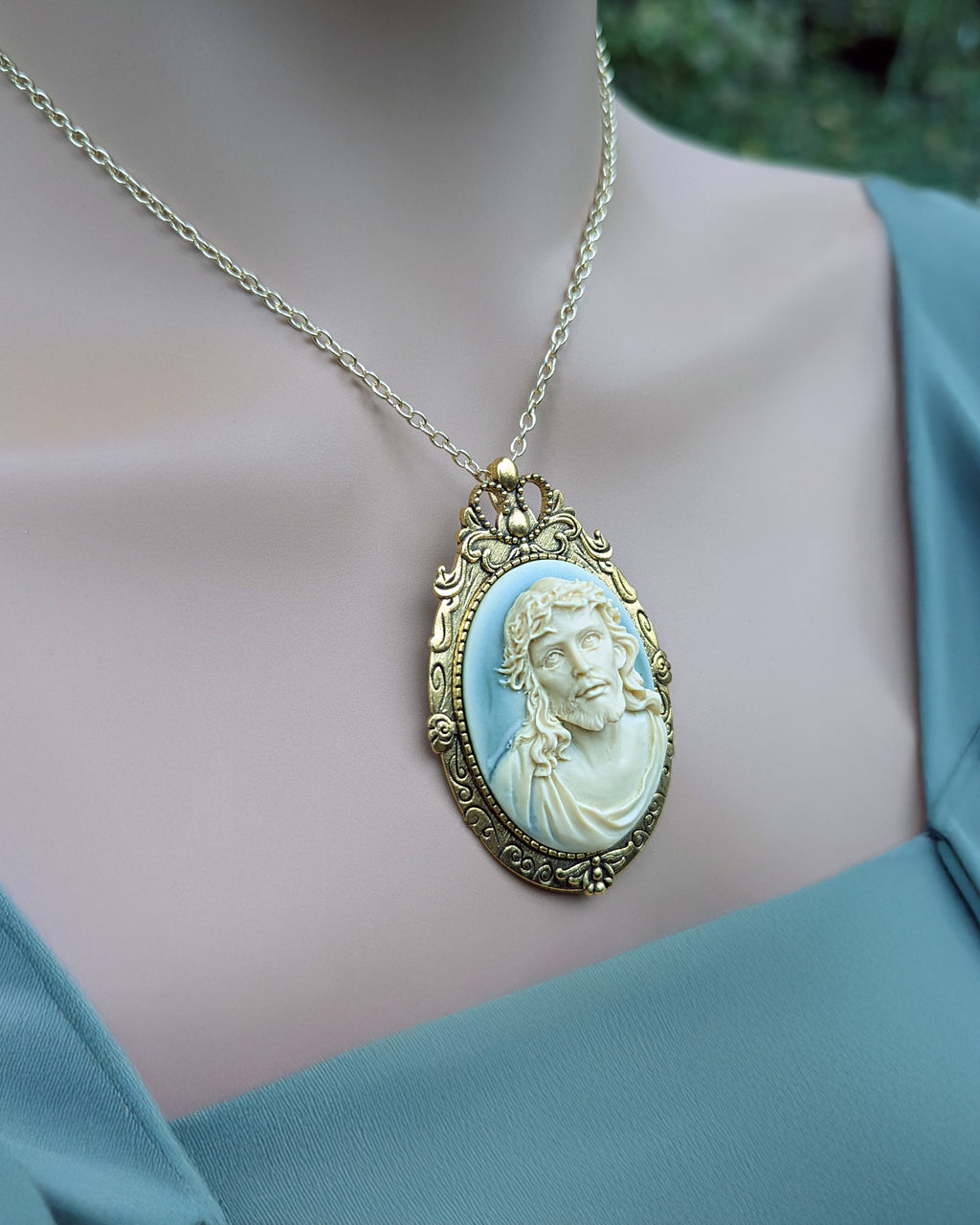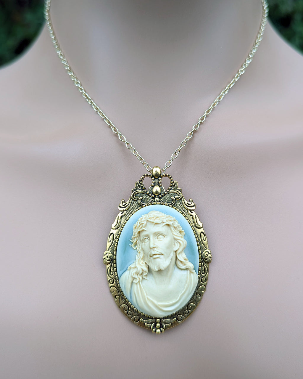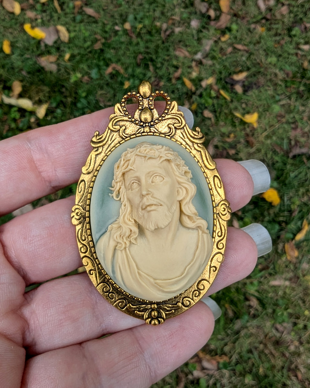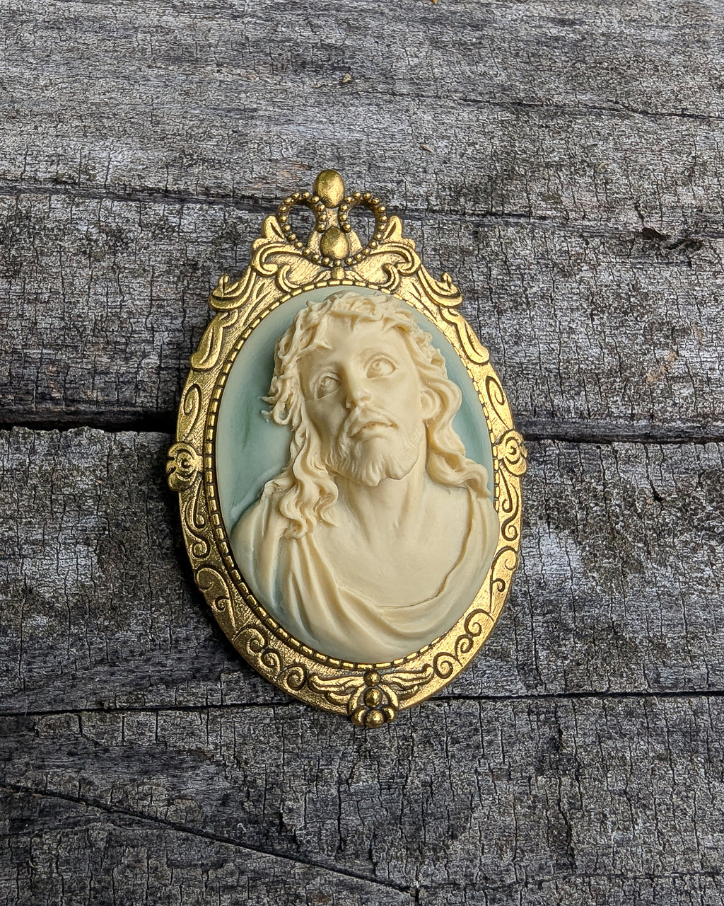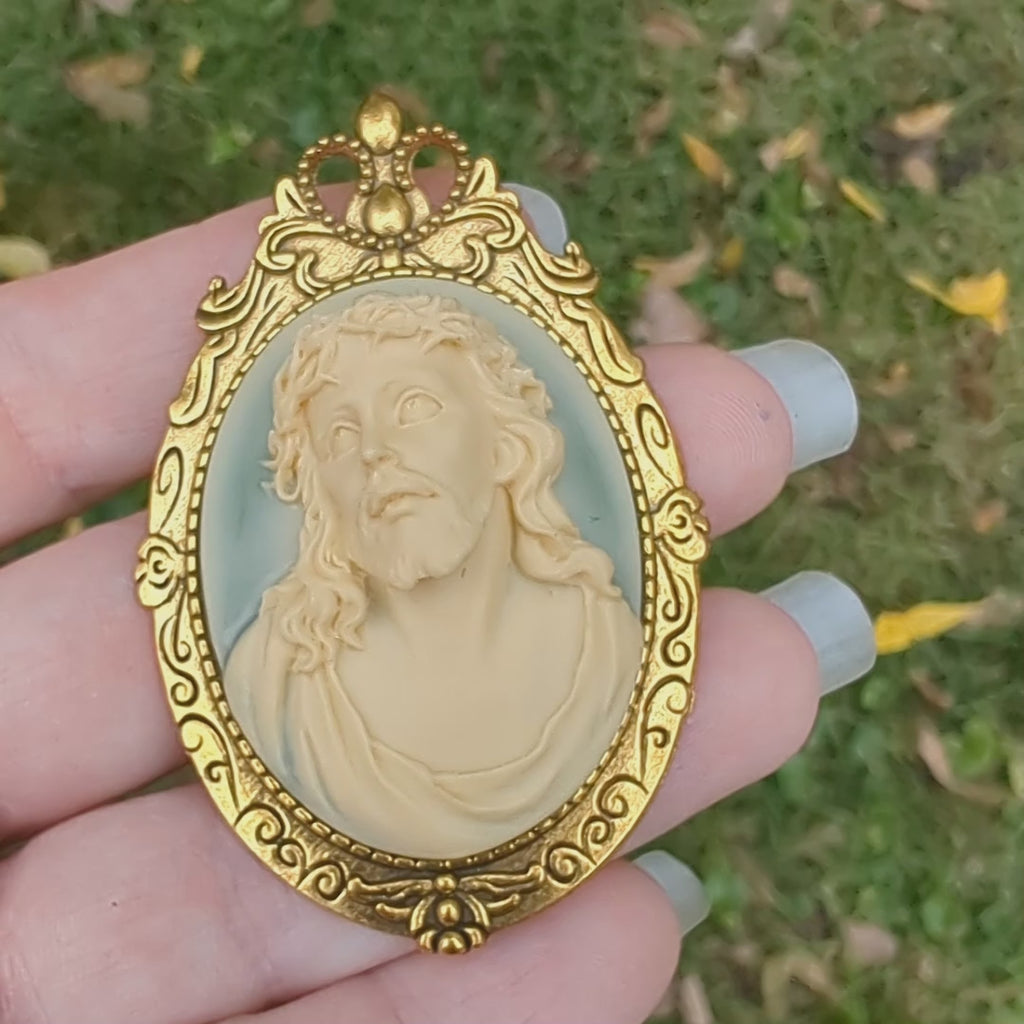 This beautiful Jesus cameo brooch pendant features a serene cream-colored relief set against a soft green background. The ornate gold toned frame is topped with a crown detail, adding a touch of vintage elegance. Measuring approximately 2" x 1.25", this versatile piece can be worn as either a brooch or a pendant. It comes on a gold toned chain in your choice of length, making it perfect for everyday wear or as a meaningful religious keepsake. A timeless and inspirational accessory for Christian jewelry collections or holiday gift giving.