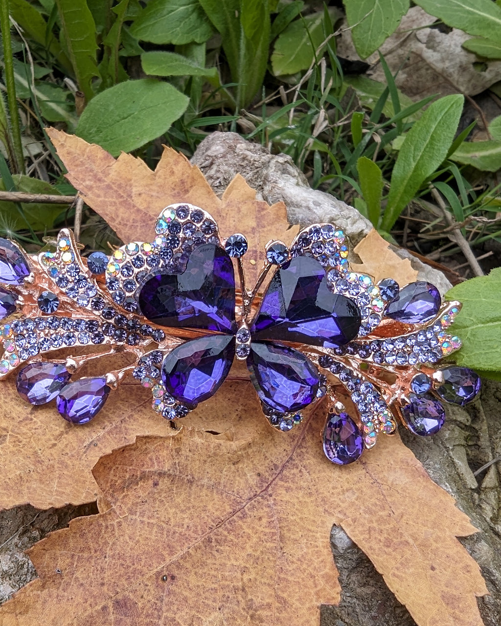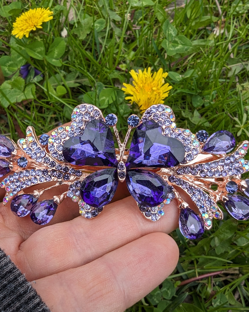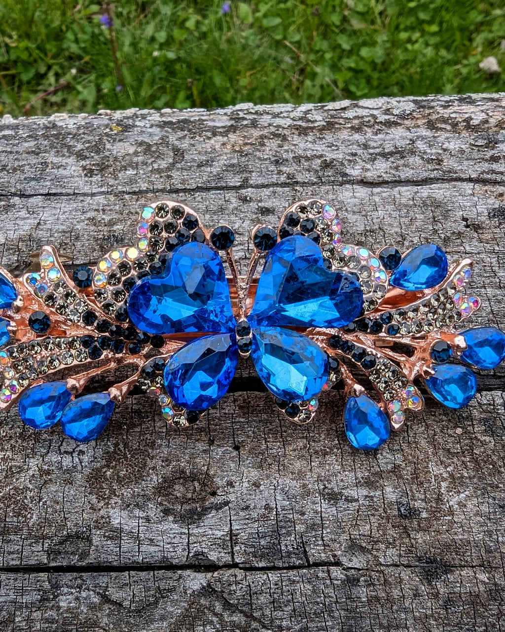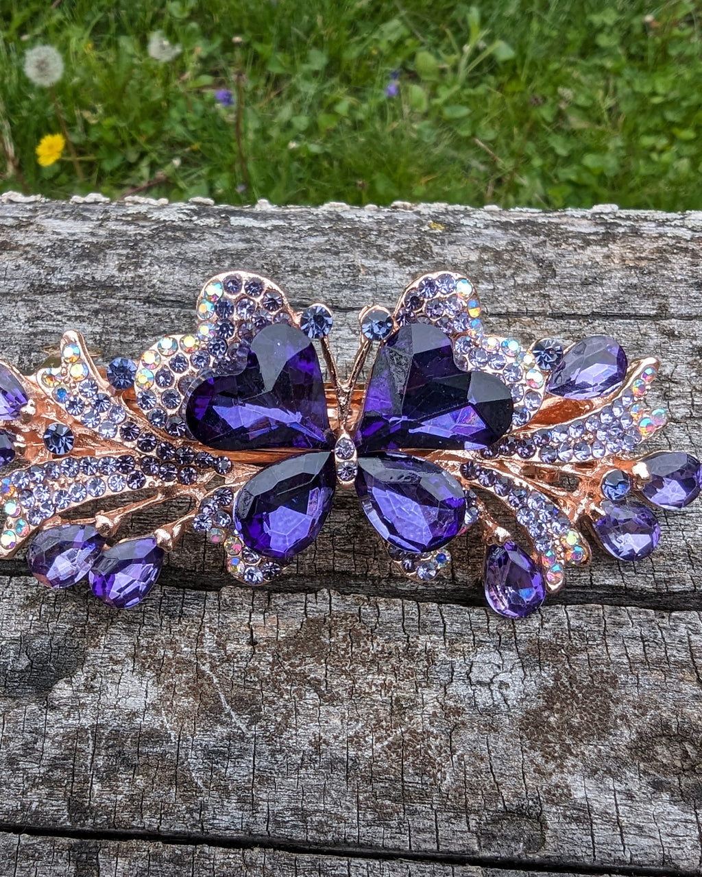 Add a touch of whimsical elegance to your hairstyle with these stunning butterfly hair clips. Available with purple, gold or blue sparkling rhinestones, this intricate design captures the delicate beauty of a butterfly, making it a perfect accessory for both everyday wear and special occasions.