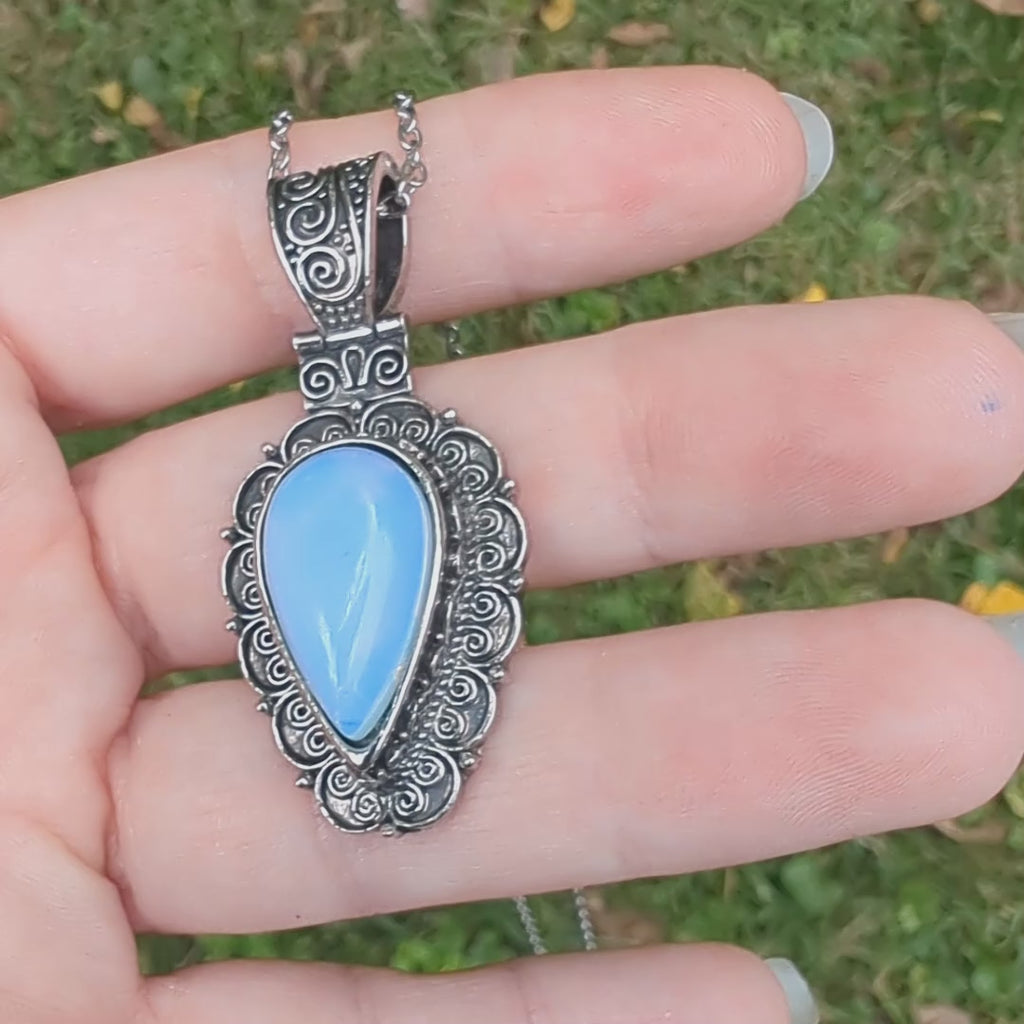 This enchanting gothic pendant necklace features a luminous faux moonstone cabochon set in an ornate antique-style silver-toned frame. The teardrop-shaped stone glows with a soft blue sheen, especially over dark clothing, beautifully complemented by the intricate filigree detailing around the setting.