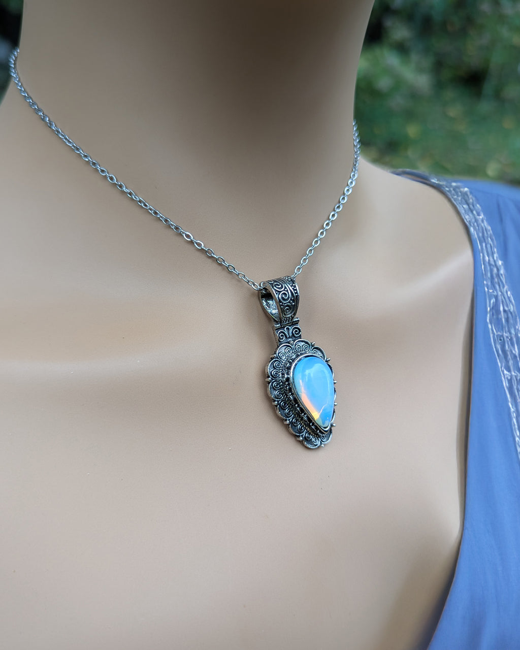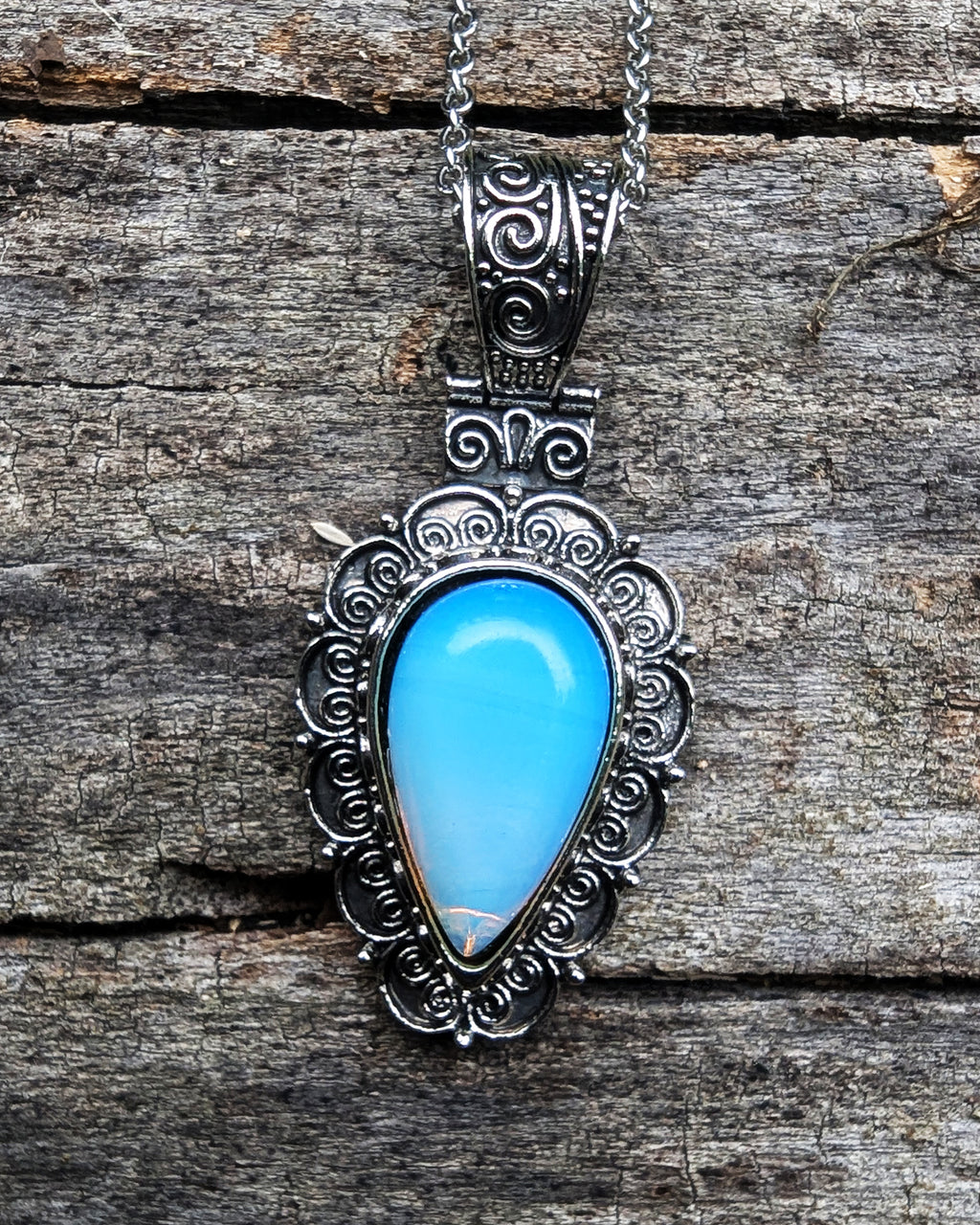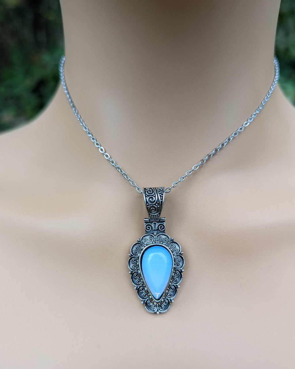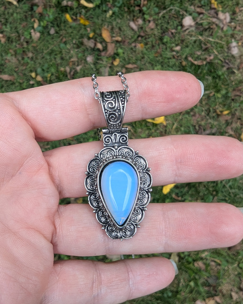 • Gothic Faux Moonstone Pendant Necklace – Teardrop Blue Stone Necklace, Boho Gothic Jewelry
