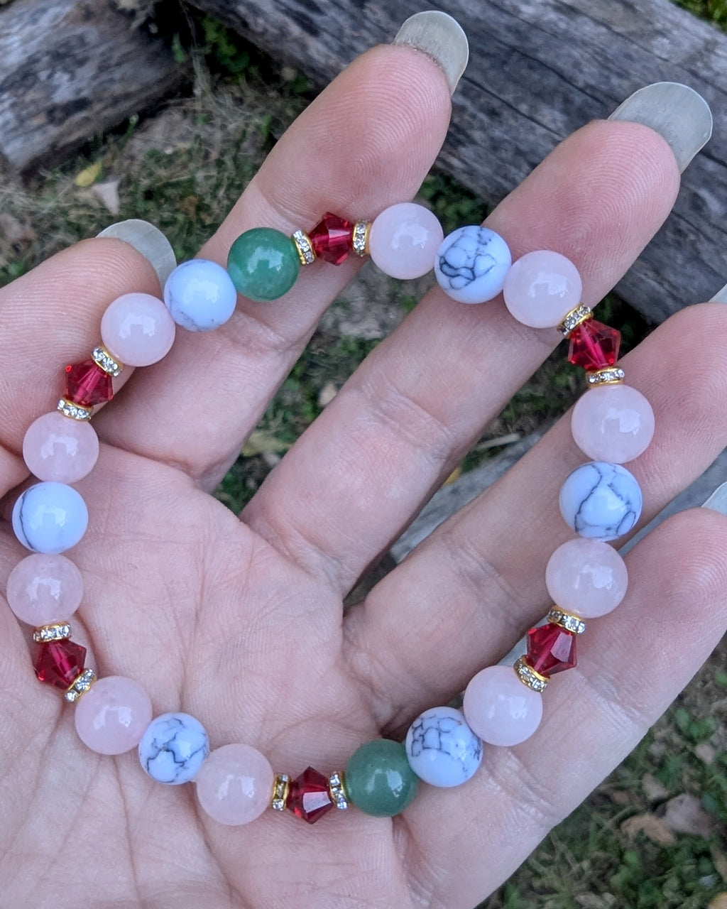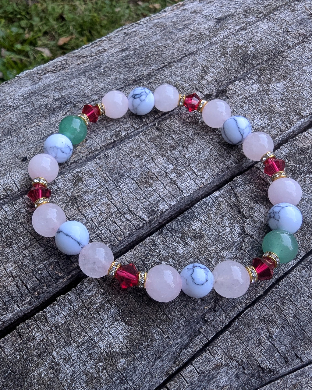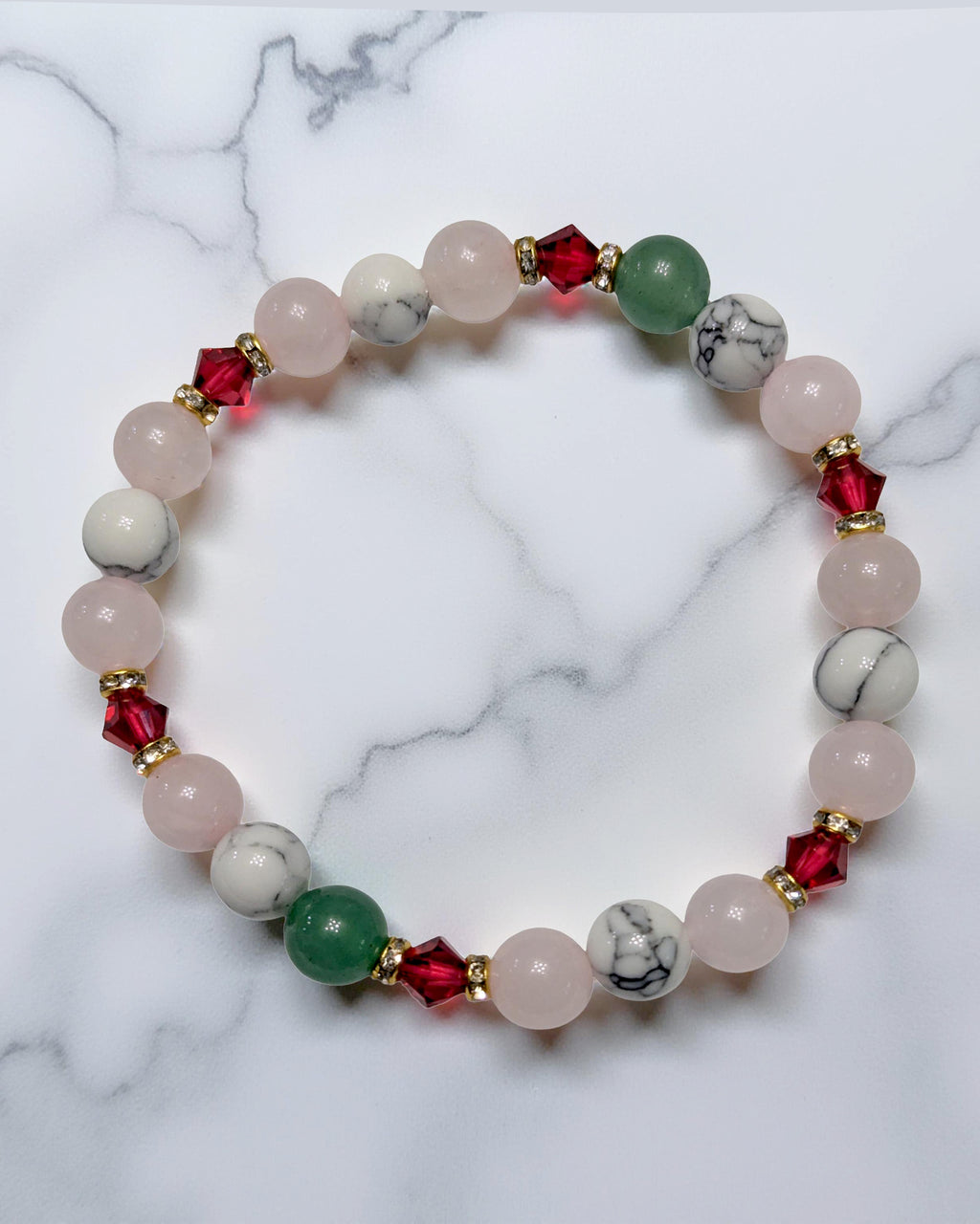 Made with 8mm natural Rose Quartz, Green Aventurine, and White Howlite stone beads