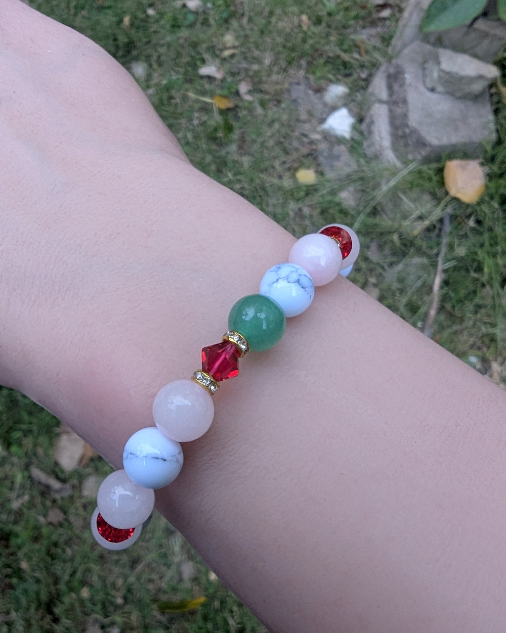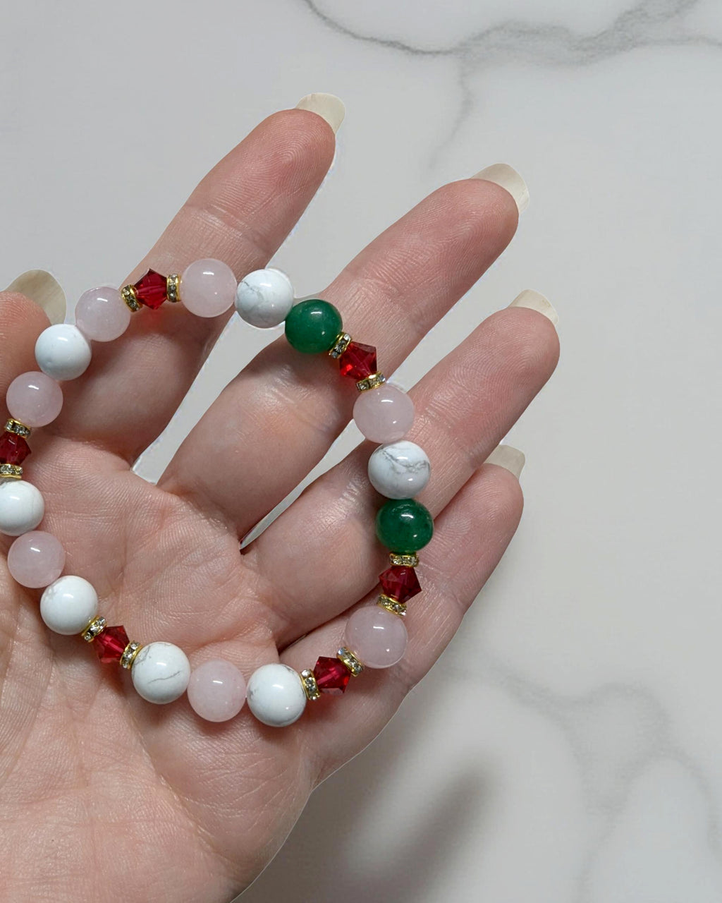 This bracelet’s soft pink, vibrant green, snowy white, and sparkling red tones make it perfect for the holiday season, yet versatile enough to wear year-round. Whether you’re looking for a Christmas party accessory, a stocking stuffer, or a meaningful gemstone bracelet, this piece is sure to shine.
