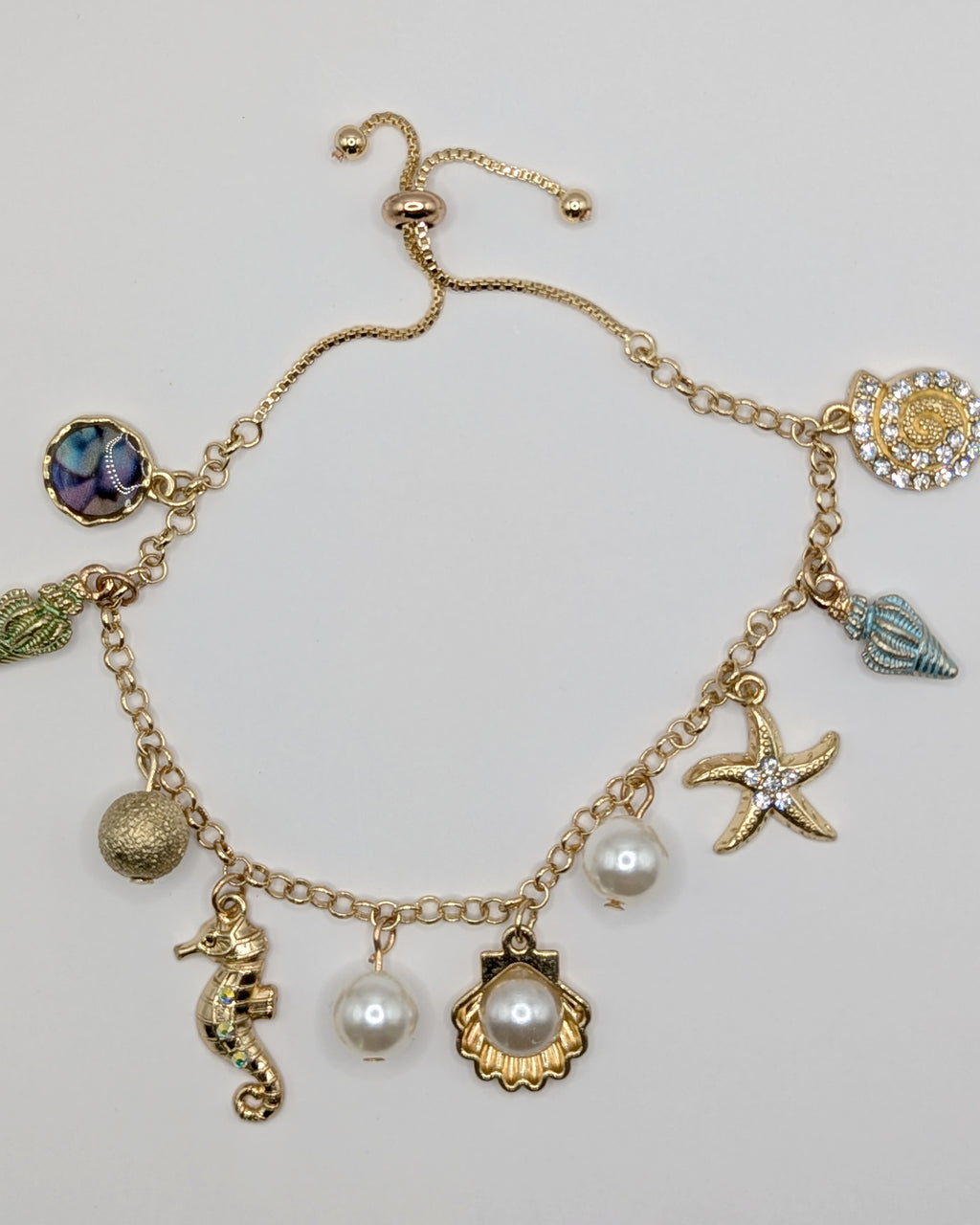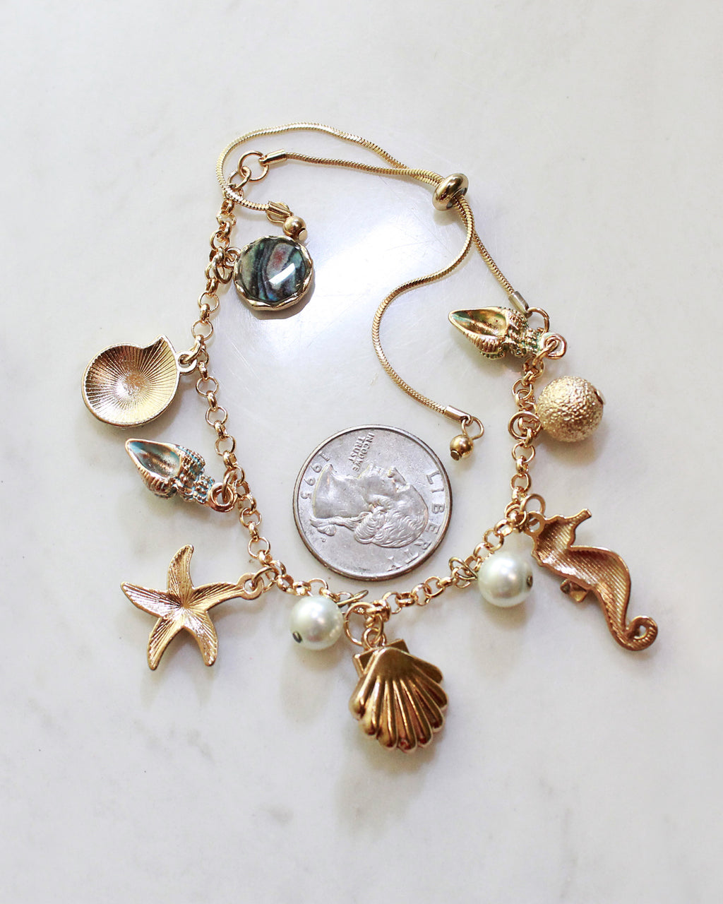 The bracelet measures 7" long and includes a 3" adjustable slider chain.  It features many sea life charms, including a seahorse, starfish and shells with pearls.
