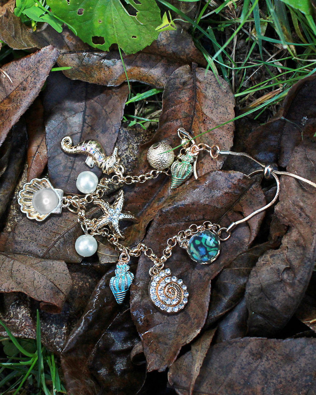 Mermaid Charm Bracelet Ocean Fantasy Jewelry with Shells, Starfish and Seahorse.