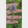 This gorgeous hand-made elven floral fantasy key necklace is made from high quality vintage materials and is sterling silver plated with Swarovski Vitrail Light crystals, (a color which shifts between pink, purple and blue colors in the sunlight), making it a truly magical piece of jewelry to behold!