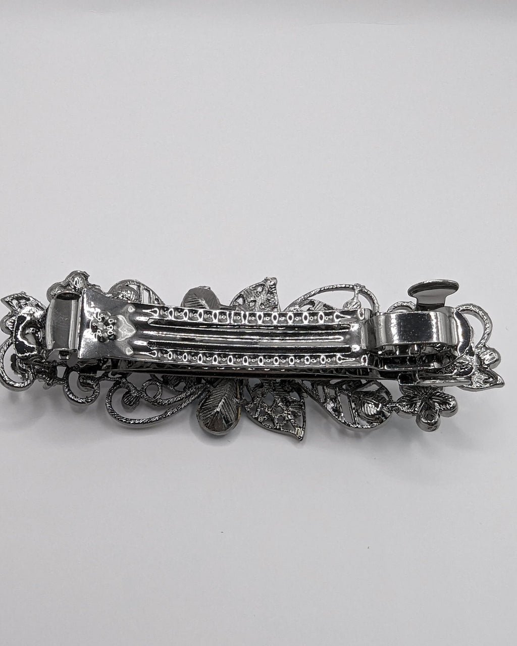 The fancy hair barrette possesses an elven charm with a playful design of antique silver toned leaves and flowers and several crisp Siam Red Swarovski crystals. With the allure of diamonds, Swarovski Crystals are made in Austria and are the highest quality lead free glass-cut crystals on the market, with extra facets and gold foiling for outstanding brilliance and sparkle.