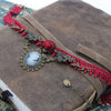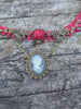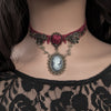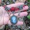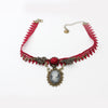 This floral Victorian choker features a red rose and bronze cameo. The pendant measure 2.5" and the necklace is 12" to 15" adjustable.