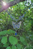 This enchanting floral silver butterfly necklace features blue capri Swarovski rhinestones and beads and a glass chandelier styled two-toned drop crystal. The vintage floral connector stampings are sterling silver plated brass. The rest of the necklace is silver toned metal. The butterfly pendant measures 2-1/2" wide and 1-1/2" tall. Along with the drop crystal, the pendant hangs 3" below the chain.